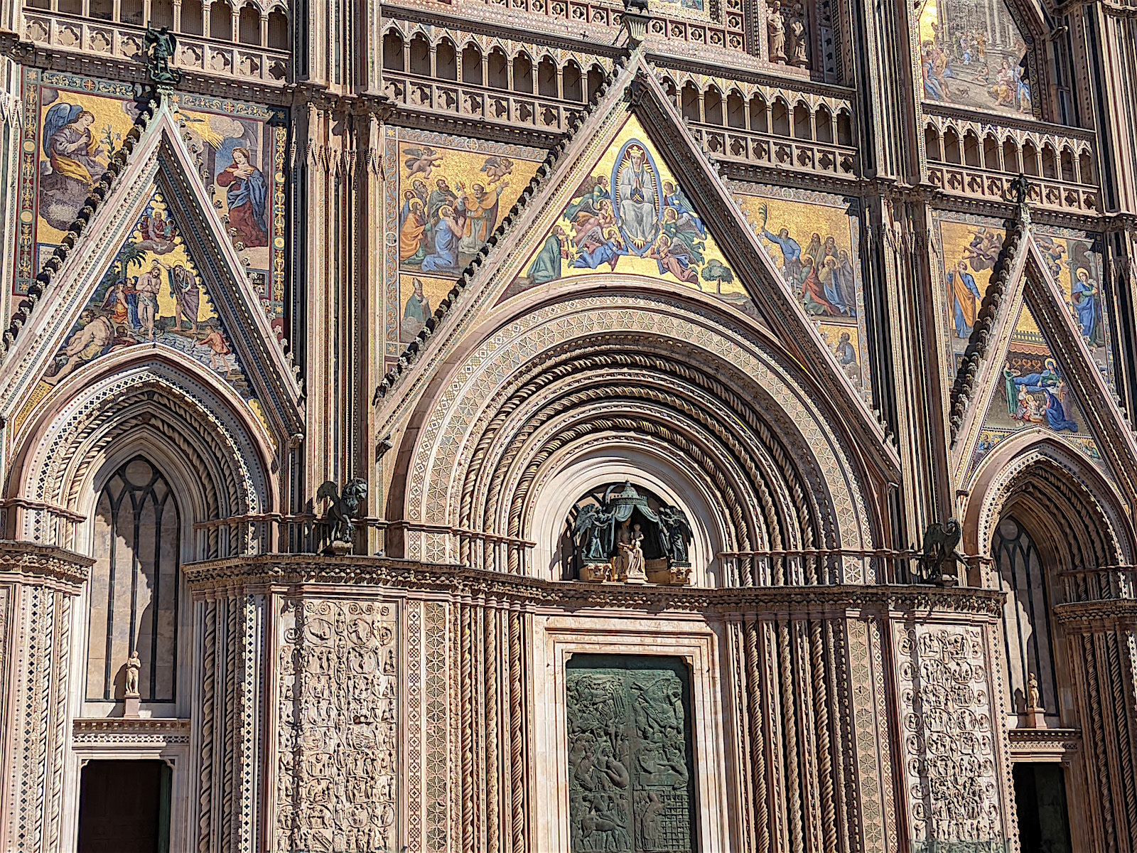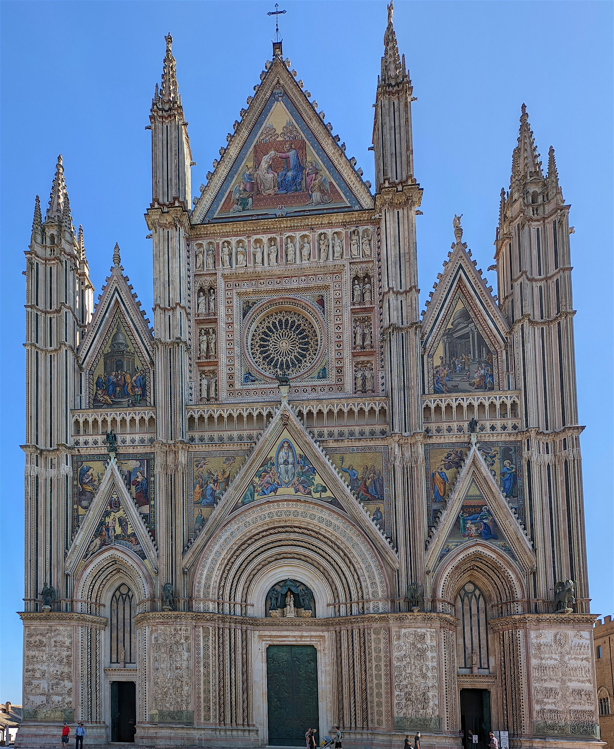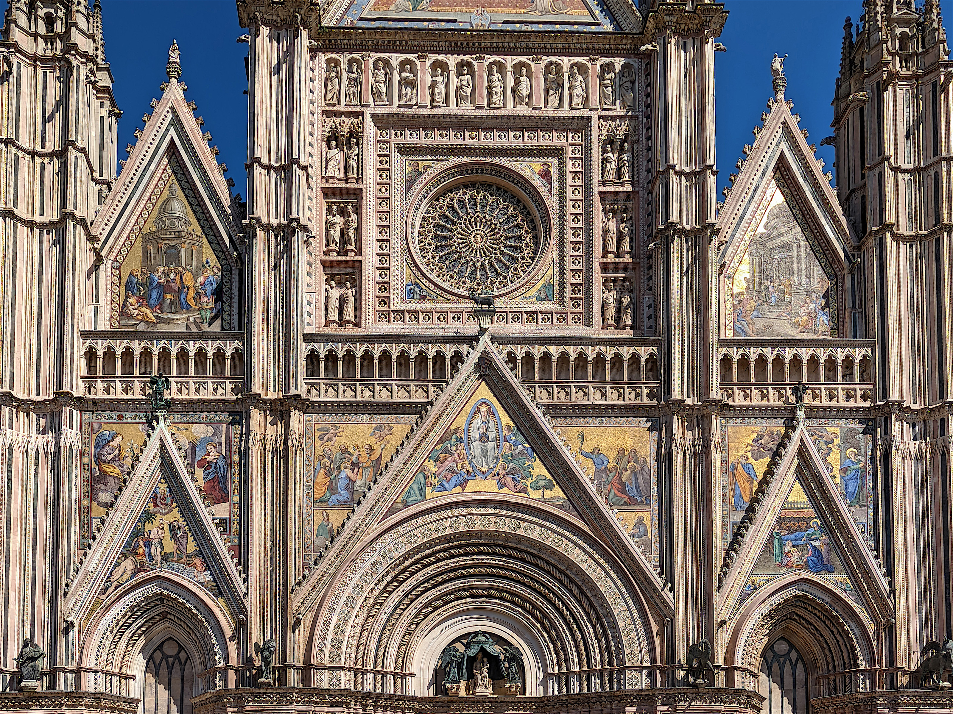 Les bas-reliefs de la façade : Vers 1320-1330 furent réalisés les bas-reliefs qui ornent les quatre pilastres de la base, entre les portes, et qui sont d’une richesse exceptionnelle. Y sont représentées, dans un entrelacs de tiges et de feuilles d’acanthe, des thèmes de l’Ancien et du Nouveau Testament. Le premier pilier raconte la création du monde, Adam et Ève, Caïn et Abel, la vie de l’Homme après le péché originel (où l’on aperçoit probablement Maitani lui-même en train de dessiner). Le second raconte la vision d’Abraham ou de Jessé : le patriarche voit se dérouler l’histoire à venir, peuplée des rois et des prophètes pour aboutir finalement à la venue du Sauveur. La vision de Jacob présentée dans le troisième pilier s’attache au Nouveau Testament : des anges contemplent en adoration différents épisodes de la vie de Jésus, depuis l’annonciation et l’incarnation jusqu’à la crucifixion et la résurrection. Le quatrième pilier est consacré au jugement dernier : la résurrection des morts, les justes conduits au Paradis où ils sont admis à contempler la gloire de Dieu, les Saints, les Apôtres, Jean et Marie devant le Rédempteur, tandis qu’en bas à droite figurent les damnés et les réprouvés conduits en Enfer. Sur les pilastres au-dessus des bas-reliefs, apparaissent quatre statues en bronze de Lorenzo Maitani, l’ange, le lion, l’aigle et le taureau symbolisant les quatre évangélistes.