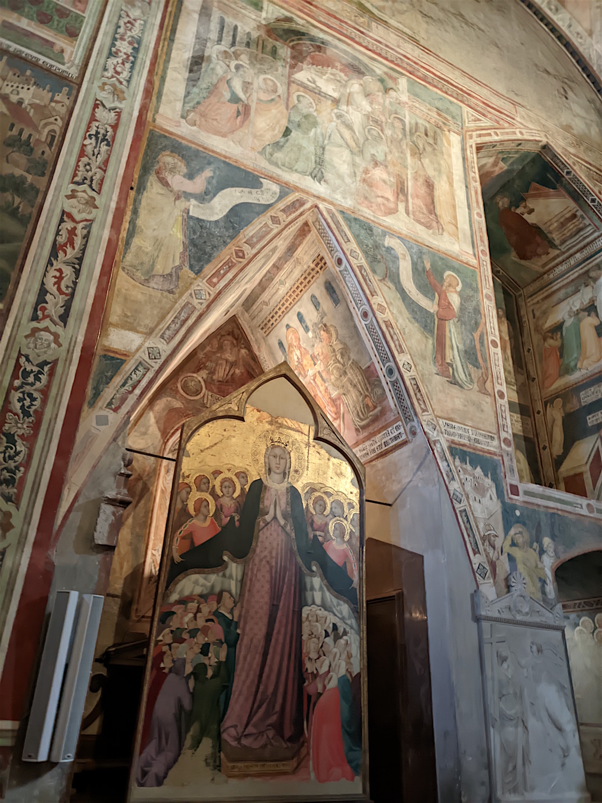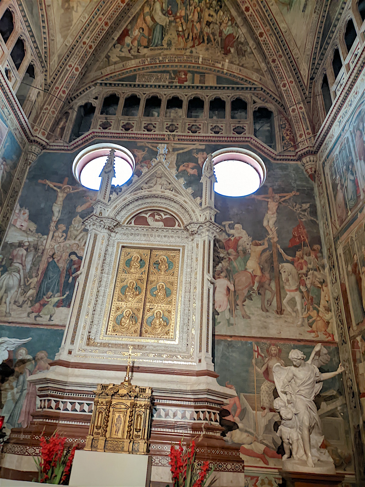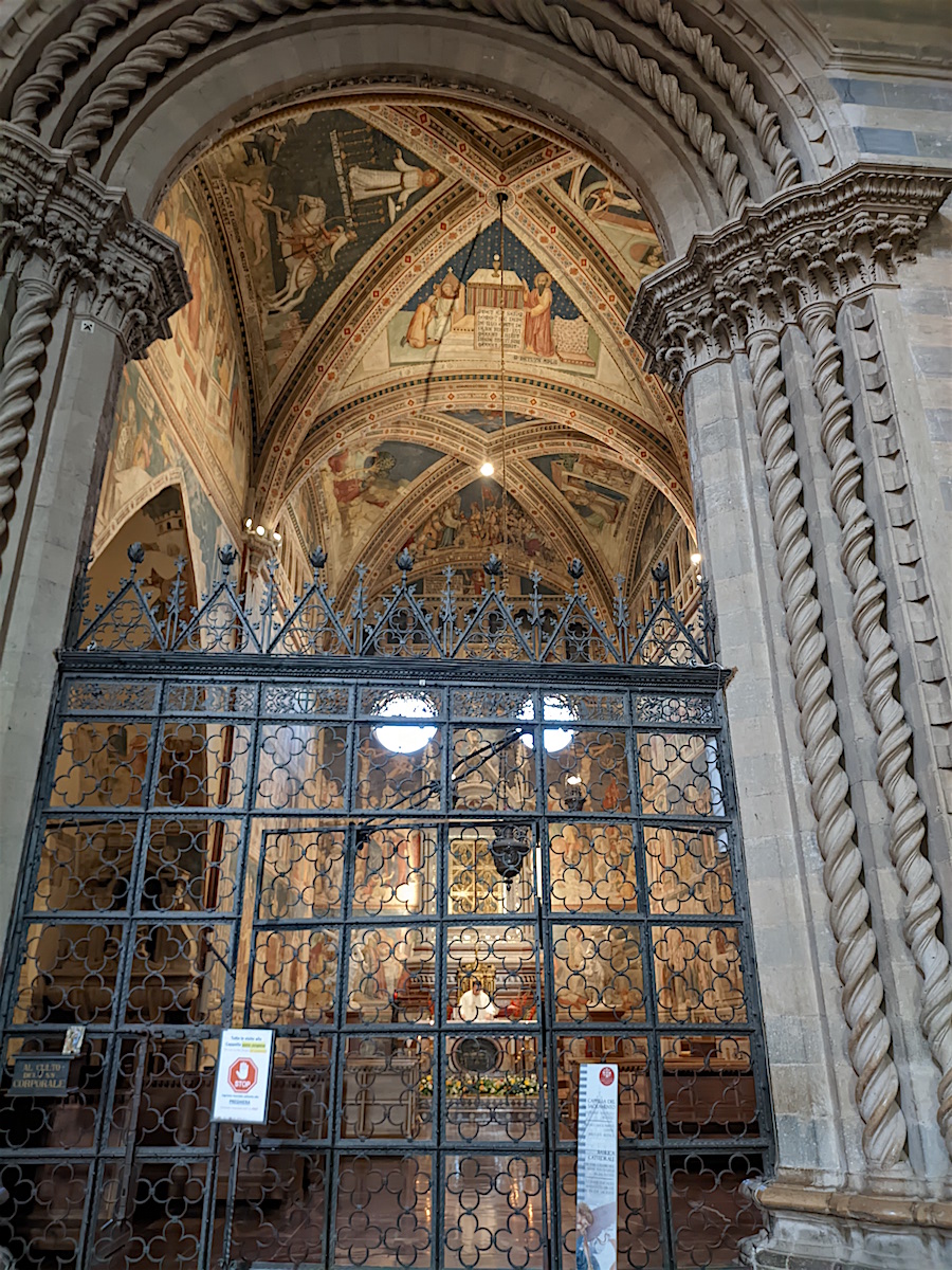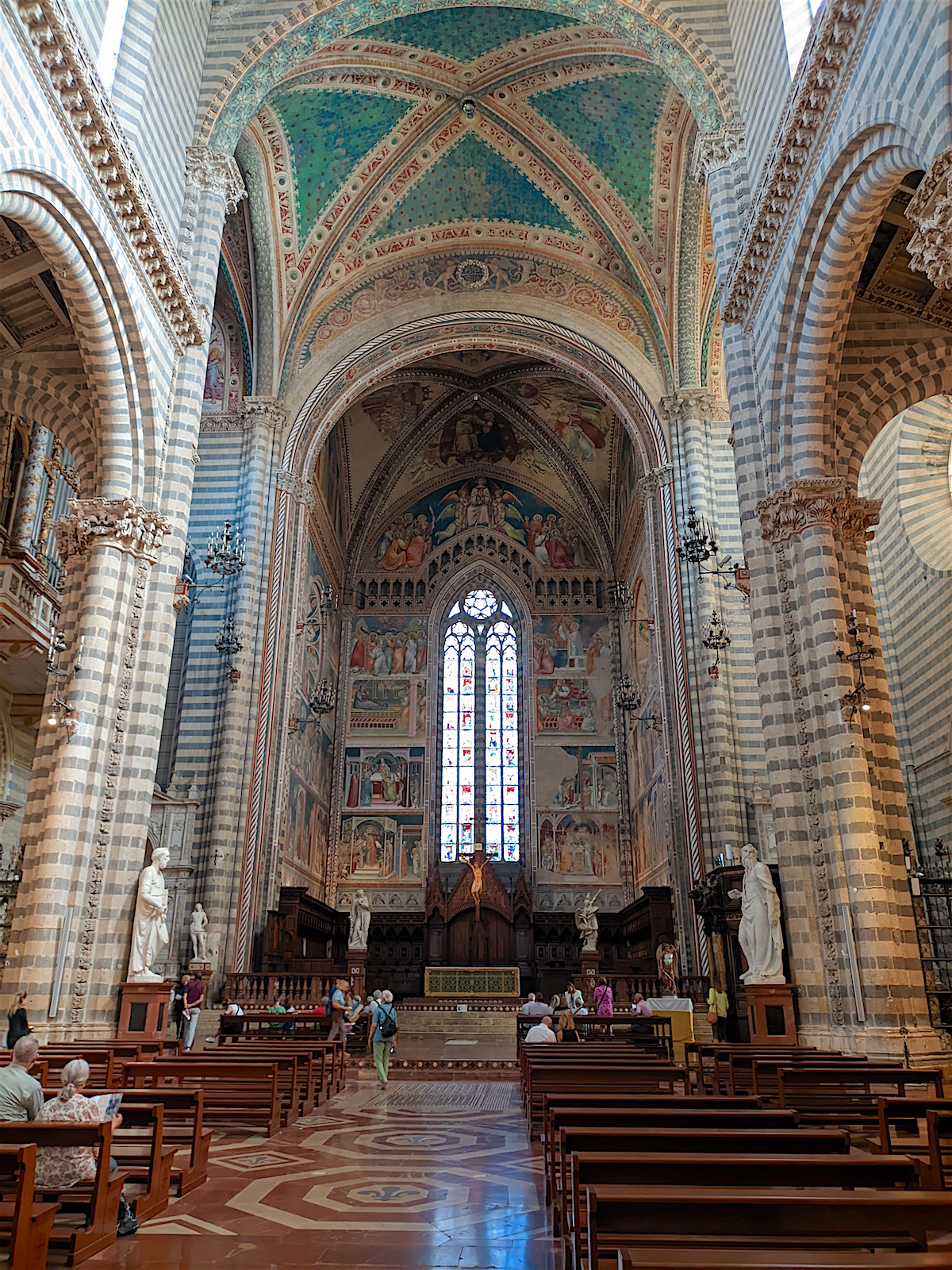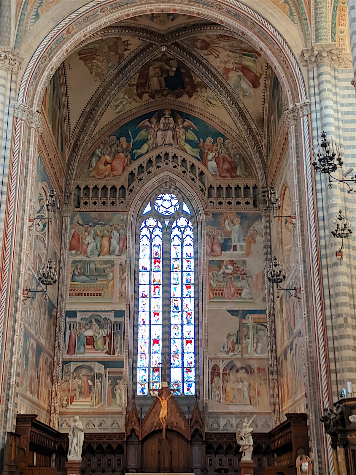 Le chœur : Dans le chœur de l’église, au centre, domine un crucifix en bois de l’école de Maitani et, sur les parois, des sculptures sur bois dans le style gothique de Giovanni Ammannati da Siena (1331-1340). Ugolino di Prete Ilario décora les parois de la tribune avec des scènes de la Vie de Marie (1370-1384). Derrière la tribune, des vitraux de Giovanni di Bonino achevés en 1334 garnissent la fenêtre de 16 mètres de haut et de 4,50 mètres de large.