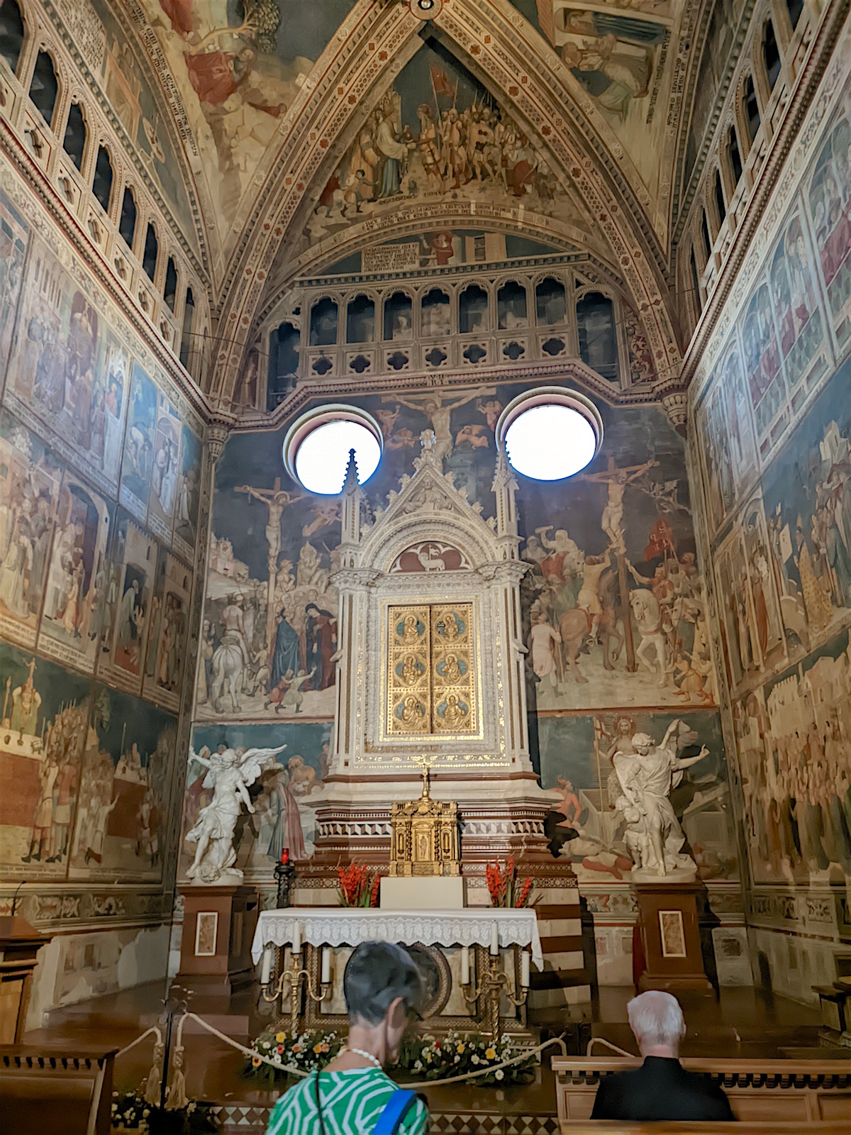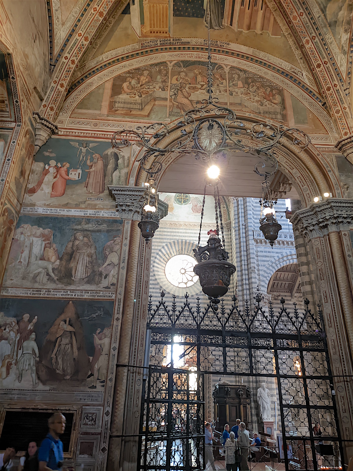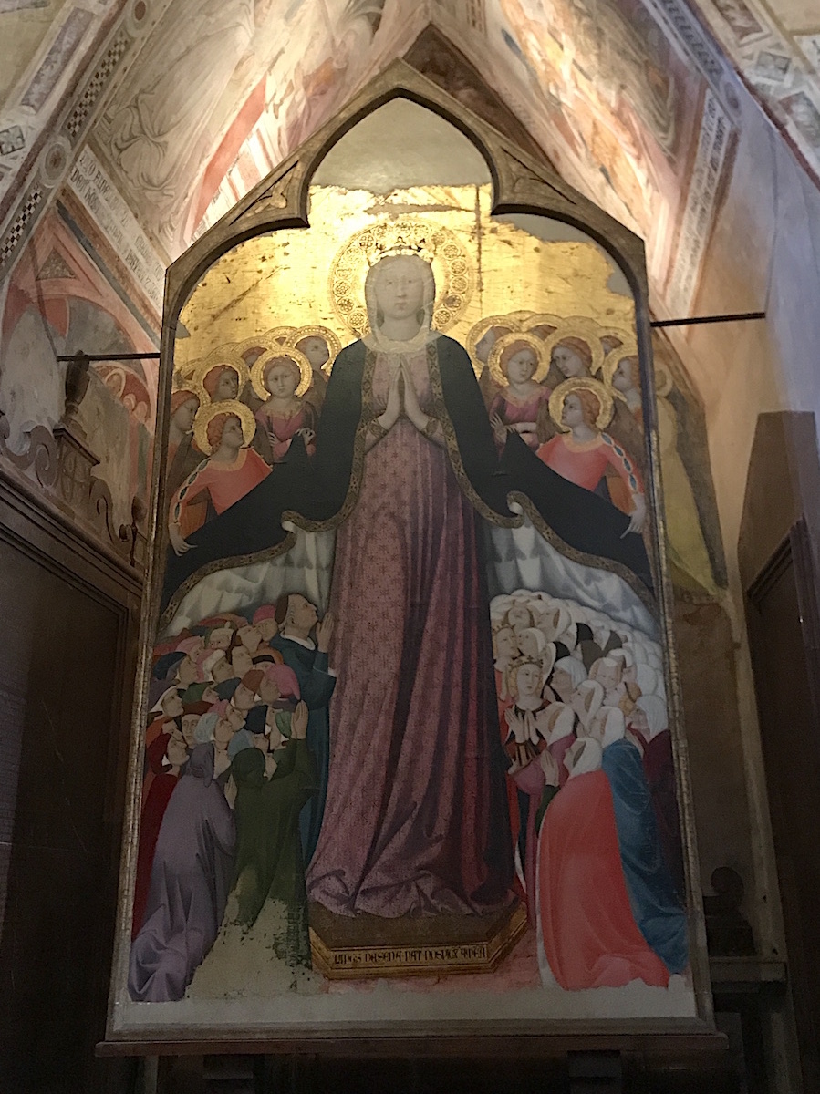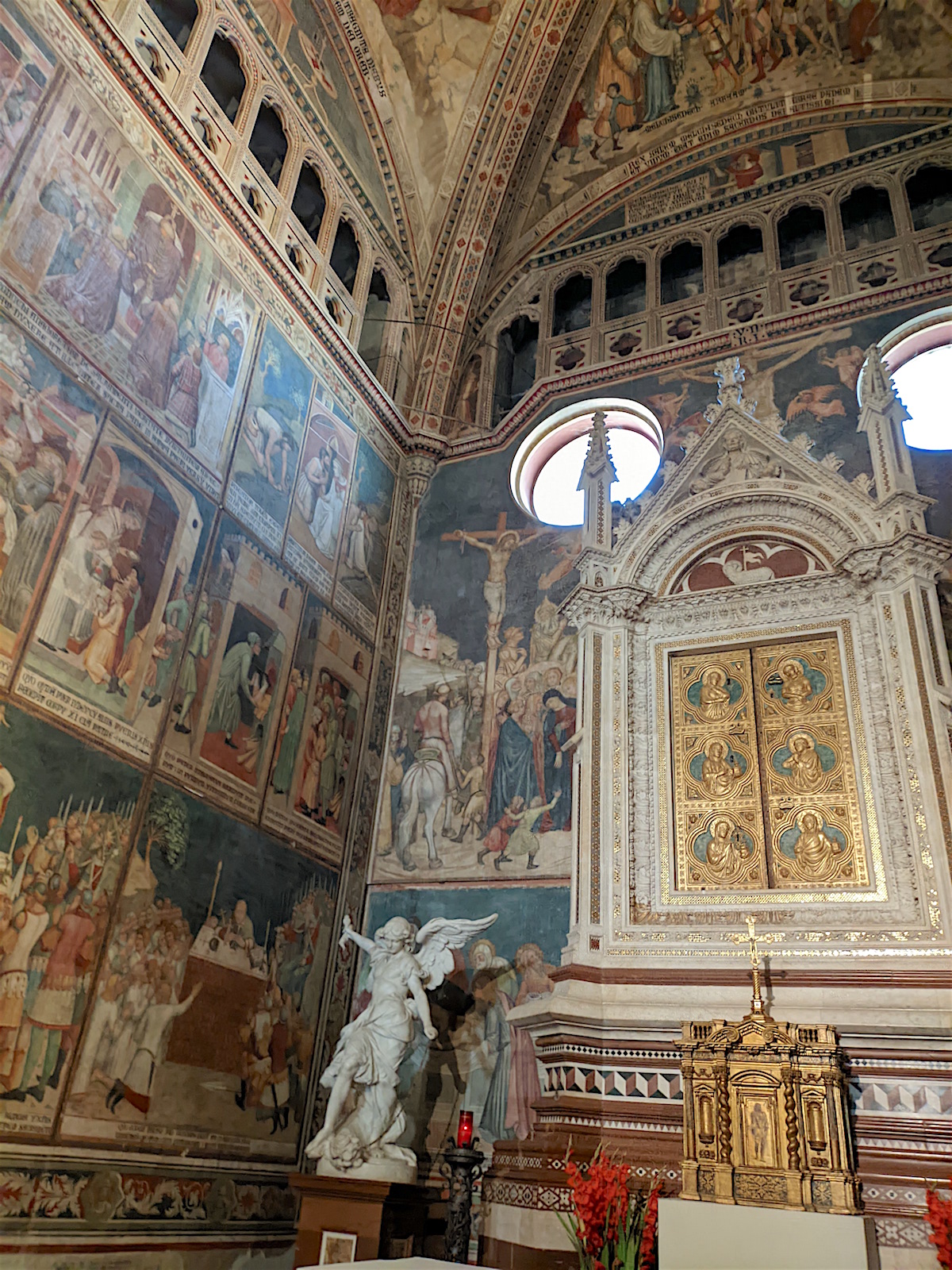 Le chœur : Dans le chœur de l’église, au centre, domine un crucifix en bois de l’école de Maitani et, sur les parois, des sculptures sur bois dans le style gothique de Giovanni Ammannati da Siena (1331-1340). Ugolino di Prete Ilario décora les parois de la tribune avec des scènes de la Vie de Marie (1370-1384). Derrière la tribune, des vitraux de Giovanni di Bonino achevés en 1334 garnissent la fenêtre de 16 mètres de haut et de 4,50 mètres de large.