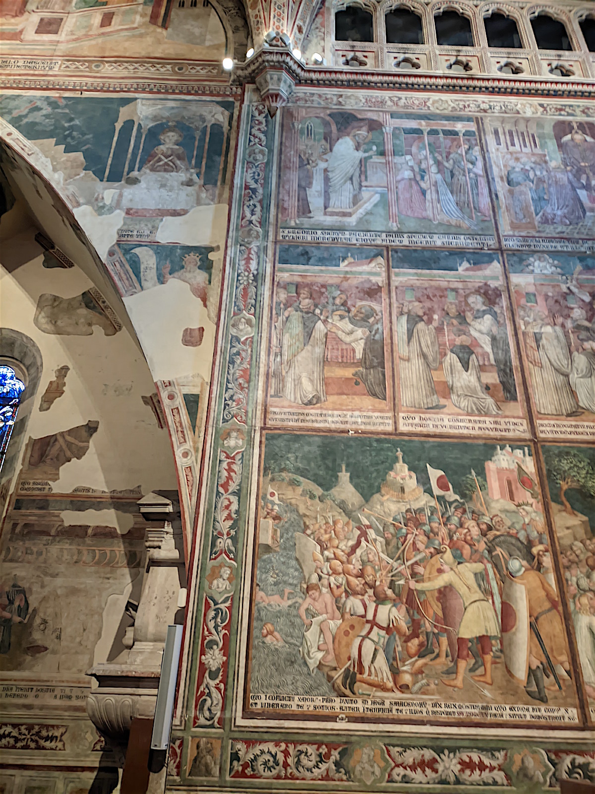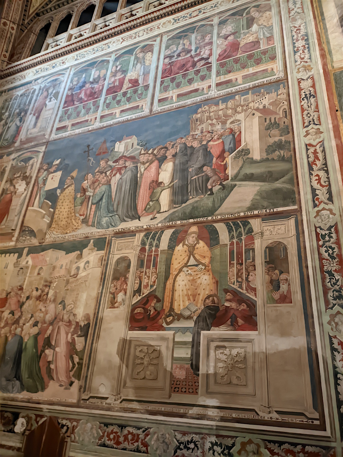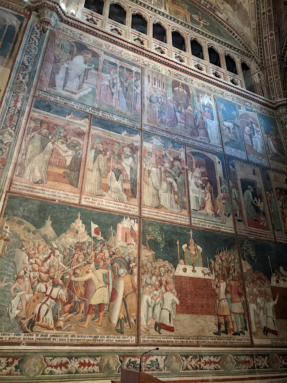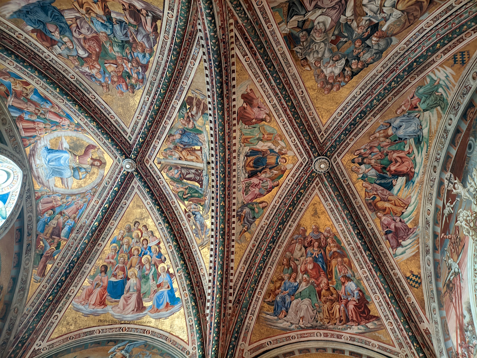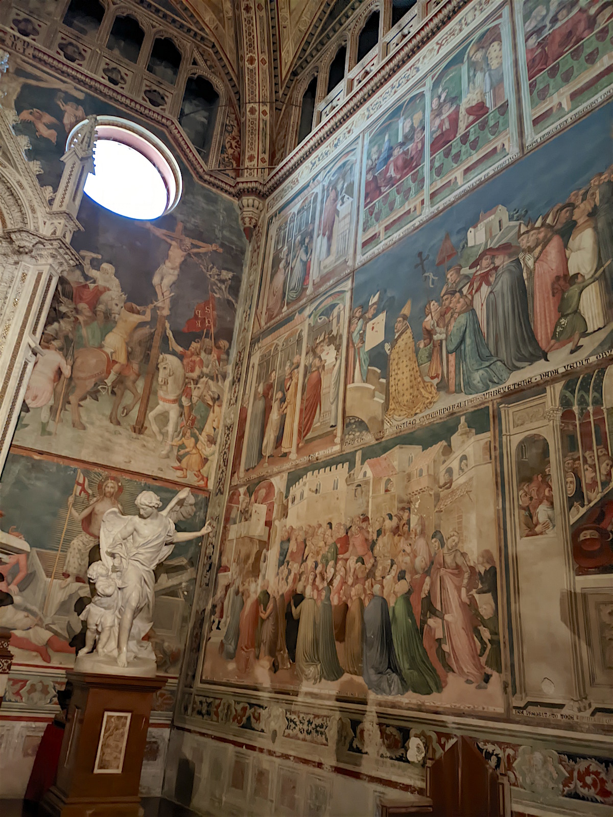 Le chœur : Dans le chœur de l’église, au centre, domine un crucifix en bois de l’école de Maitani et, sur les parois, des sculptures sur bois dans le style gothique de Giovanni Ammannati da Siena (1331-1340). Ugolino di Prete Ilario décora les parois de la tribune avec des scènes de la Vie de Marie (1370-1384). Derrière la tribune, des vitraux de Giovanni di Bonino achevés en 1334 garnissent la fenêtre de 16 mètres de haut et de 4,50 mètres de large.