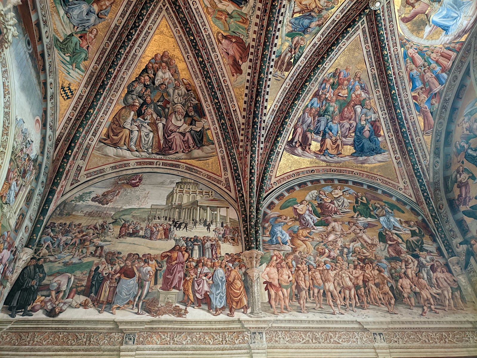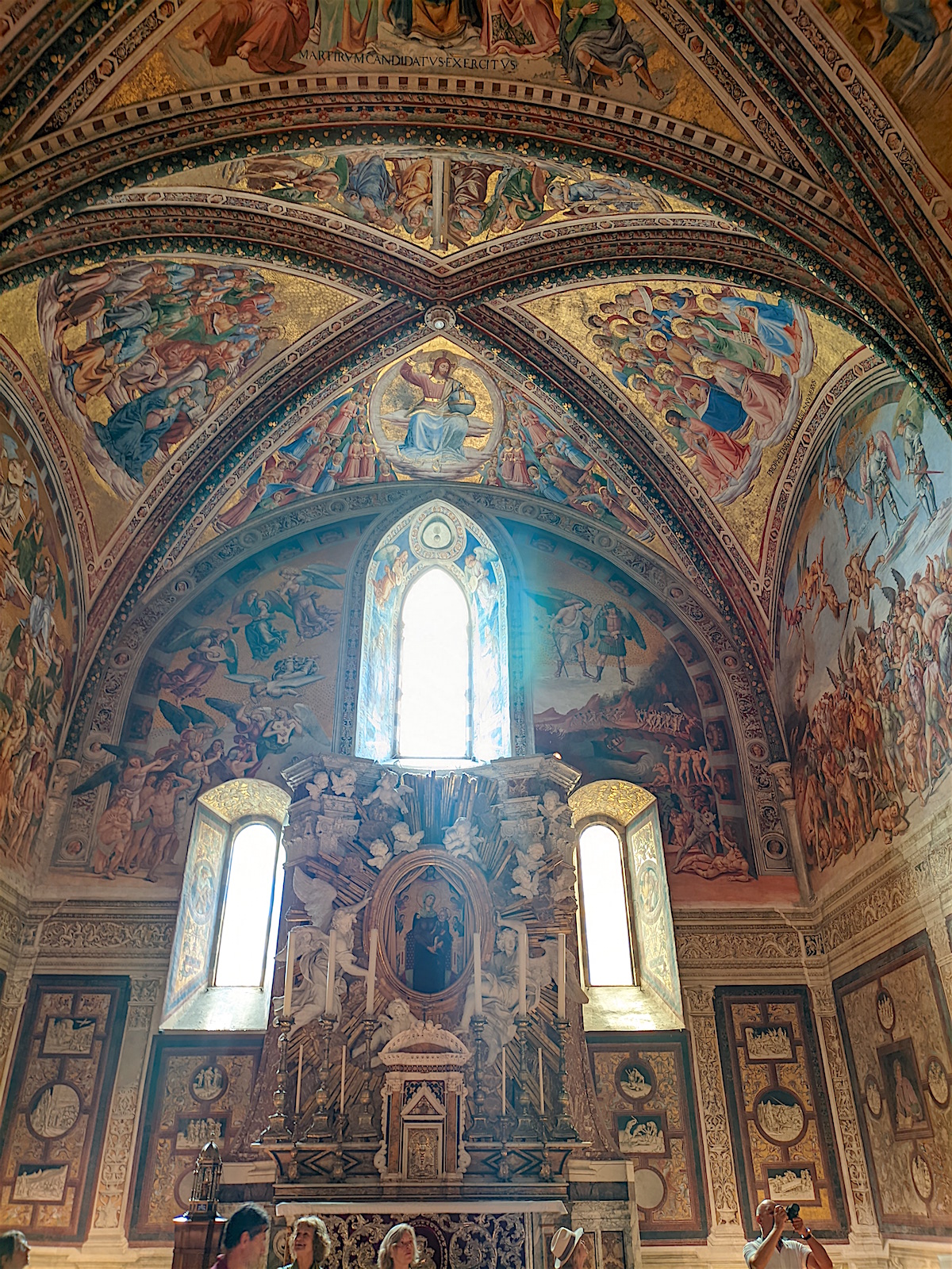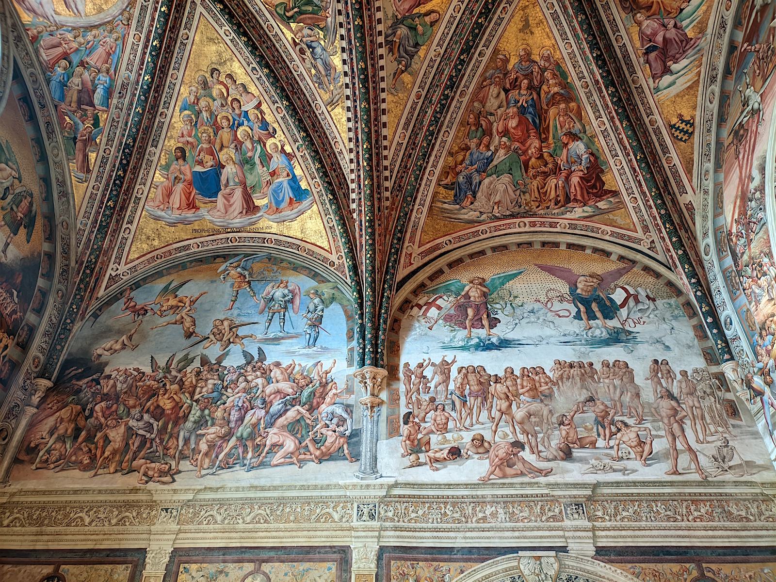 La chapelle San Brizio : Du côté droit de la croisée, on peut accéder à la Cappella Nova ou Cappella San Brizio (1408) – la chapelle Saint-Brice – qui figure parmi les plus importants témoignages de la peinture italienne. La conception spatiale particulière de la chapelle et le cycle de fresques qui la décorent, réalisées en partie par Fra Angelico (1447-1449) et achevées par Luca Signorelli (1499-1504), font de cette chapelle un cas unique dans l’art italien. Signorelli conçut la chapelle comme une sphère où, autour de l’observateur, tous les points ont la même importance. Le peintre, se conformant au programme des chanoines de la cathédrale, cherche à frapper l’imagination des fidèles dans la tradition de la peinture médiévale, en donnant une vision prémonitoire de la fin du monde où l’Humanité devra subir le châtiment de la justice divine. Toute l’eschatologie chrétienne est résumée en cinq scènes de l’Apocalypse et du Jugement dernier : le Storie dell’Anticristo, il Finimondo, la Resurrezione della carne, i Dannati, gli Eletti, il Paradiso et L’Inferno. Tandis que Fra’Angelico s’attache dans ses deux panneaux à un soin extrême du détail, Signorelli recherche l’effet d’ensemble, par exemple dans le Jugement dernier, accompagné de représentations de type architecturaux comme la colonnade de la partie inférieure ou bien les fenêtres où apparaissent des personnages illustres (Dante, Virgile, Ovide qui lisent des livres ou des codex, et Empédocle regardant au-dehors de son cadre, tous appuyés sur le rebord), en un jeu d’illusions et de perspective qui donne la sensation d’entrer dans la scène peinte. Dans ses compositions, et notamment dans l’Enfer, Signorelli, s’inspirant de Dante, cherche moins à rendre la gloire divine qu’à exprimer le sentiment des êtres humains devant une réalité terrifiante. L’artiste se concentre ainsi sur les êtres qui souffrent dans leur âme et leur corps, dépeints dans un style naturaliste, et qui supplient en exprimant une vaine révolte contre leur sort.