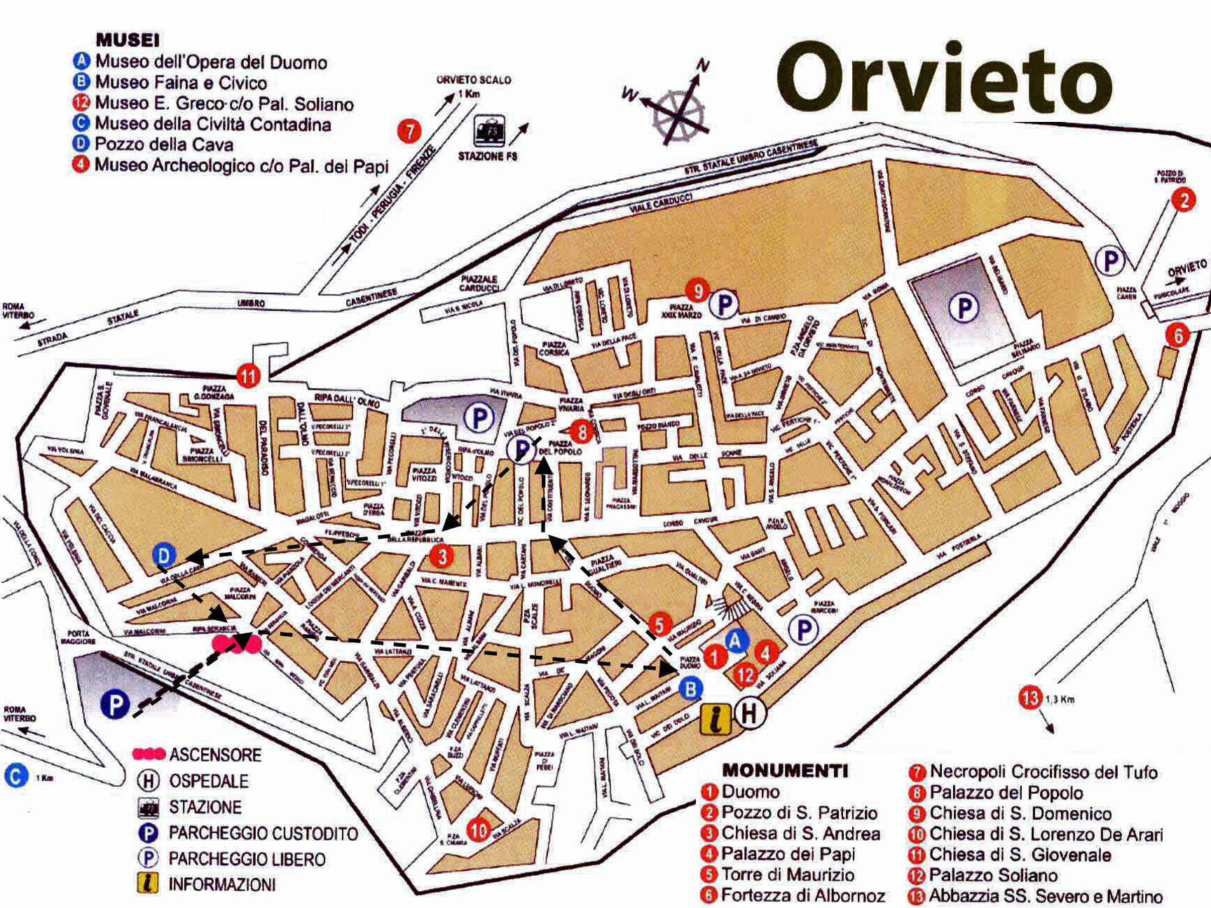 TORRE DEL MORO : Le Palazzo dei Sette avec la Torre del Moro est l’un des monuments les plus intéressants d’Orvieto. Construit par la famille Della Terza à la fin des années 1200, situé dans une position stratégiquement centrale, il a servi de siège public aux Sept Seigneurs ou Consuls qui représentaient les arts. Au cours de cette période, le Palazzo Comunale a été restauré, les travaux de construction du Palazzo del Capitano del Popolo et de la cathédrale ont commencé, tous des monuments symbolisant les pouvoirs de la municipalité. Le Palazzo della Mercanzia ou Palazzo dei Signori Sette est entré en fonction en 1319 mais en raison du déclin de la municipalité libre, le palais est passé aux mains de la papauté. En 1515, le pape Léon X céda la tour connue à l’époque sous le nom de "Torre del Papa" à la municipalité. À partir de ce moment, on pense que le nom qu’il a pris plus tard, doit être attribué à Raffaele di Sante, dit "il Moro". Au sommet, vous pourrez admirer la cloche coulée en 1313 pour le Palazzo del Capitano del Popolo et transférée ici en 1876, qui montre les 25 symboles des Arts et un sceau du peuple. La deuxième cloche a été ajoutée au 19ème siècle ; l’ajout de l’horloge date de la même période, plus précisément de 1875. La tour haute de 47 mètres est parfaitement orientée selon les quatre points cardinaux. Une dernière curiosité vient de l’inscription accrochée à la Torre del Moro à l’entrée de la Via della Costituente. Ici sont gravés les vers du Purgatoire de la Divine Comédie de Dante Alighieri qui rappellent les luttes sanglantes entre les familles Orvieto des Monaldeschi et des Filippeschi au temps des communes. "Venez voir Montecchi et Cappelletti, Monaldi et Filippeschi, un homme insouciant, déjà triste de couleur, et ceux-là avec des soupçons !"