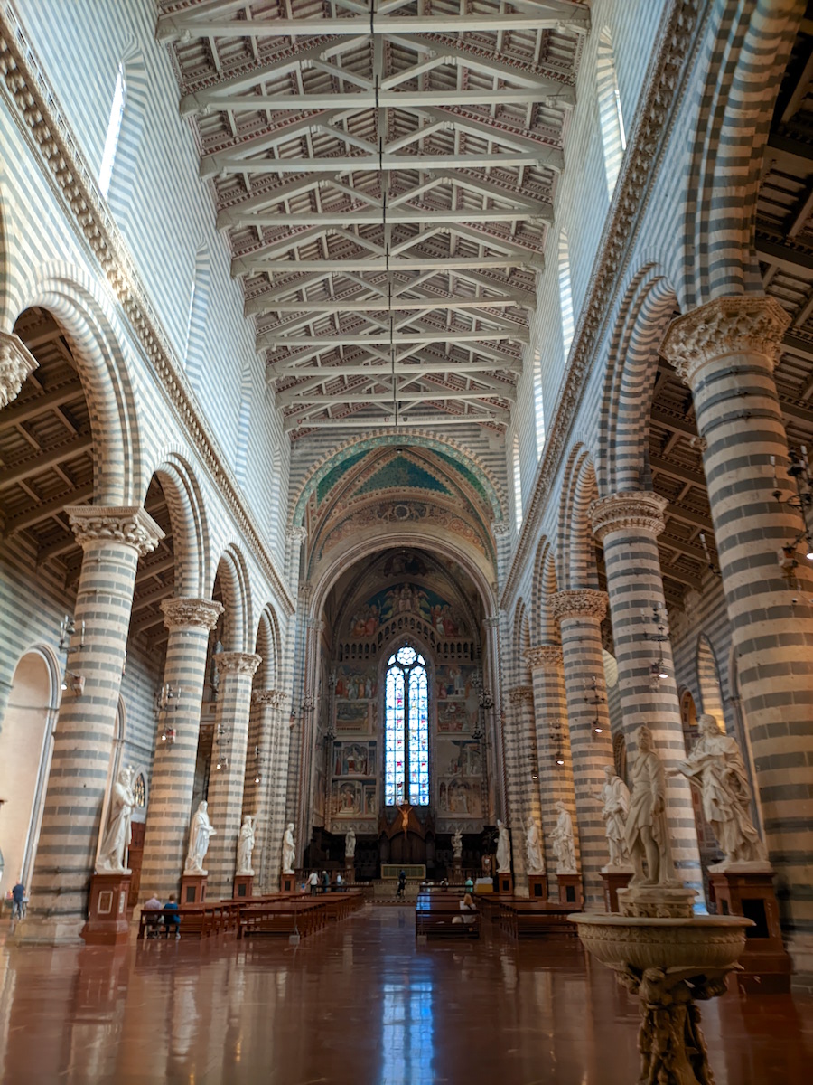 L’intérieur est de type basilical à trois nefs divisées par dix colonnes et deux pilastres de basalte noir et de travertin blanc, ornés de riches chapiteaux, dont certains réalisés par Fra Guglielmo de Pise et Ramo di Paganello. D’une longueur de 90 mètres et large de 33 mètres pour une hauteur de 34 mètres, la cathédrale mêle les formes romanes du dessin primitif et l’élancement ogival du chœur, le tout éclairé par douze ouvertures situées au-dessus des galeries par des grandes ouvertures absidiales. Le pavement, en calcaire rouge de Prodo, s’étend de l’entrée jusqu’à l’abside et donne une illusion de longueur plus importante qu’en réalité. Après les fonts baptismaux (1390-1407) de Luca Giovanni, la vasque d’eau bénite (1485) d’Antonio Federighi et les cinq chapelles semi-circulaires des nefs latérales, revêtues de fresques (XIVe et XVe siècles), la croisée du transept héberge 6 statues : une Pietà d’Ippolito Scalza (1579), un Christ à la colonne de Gabriele Mercanti (1627), une Madone de Raffaello da Montelupo (1563), un Ecce Homo également de Scalza, et deux statues d’Adam et Ève de Fabiano Toti.